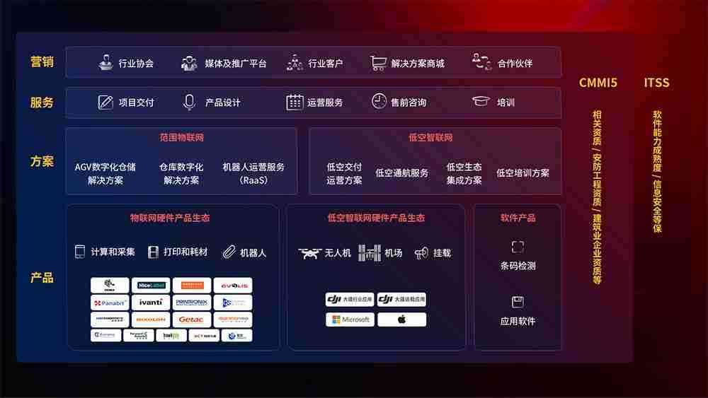 聚合国内外先进的物联网硬件产品品牌,,聚焦数字化仓储、、、、机器人运营、、、低空智联网等领域,,共同打造适合客户业务场景的解决方案并提供交付服务
